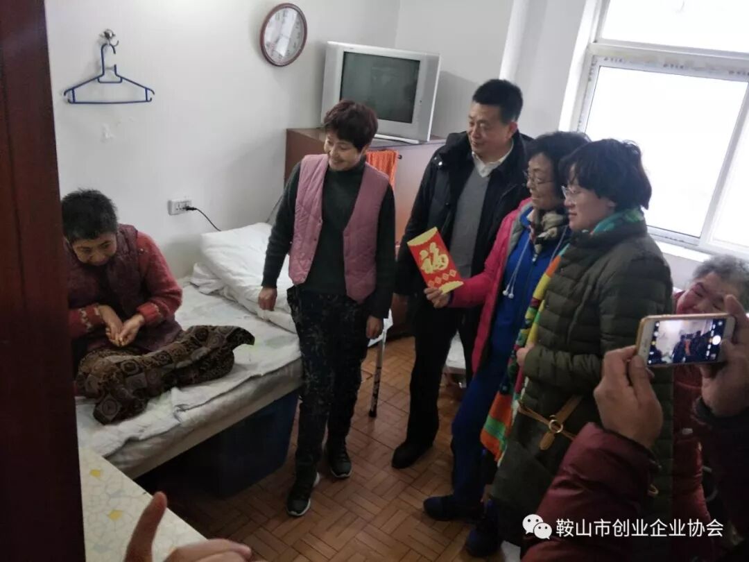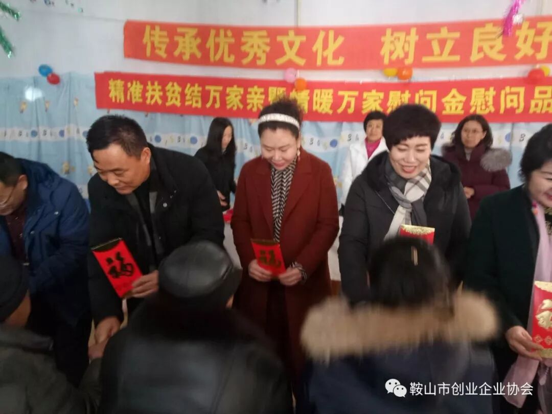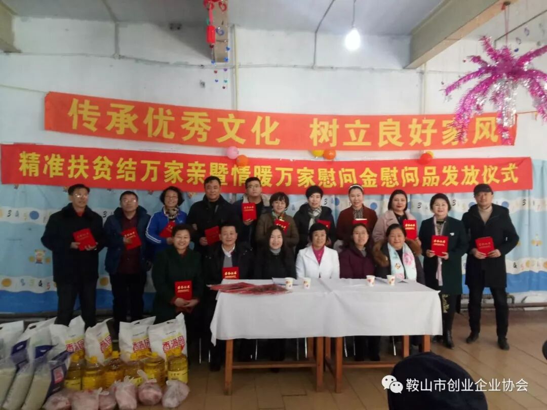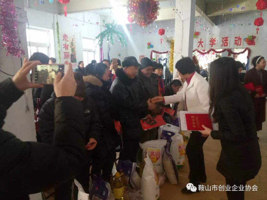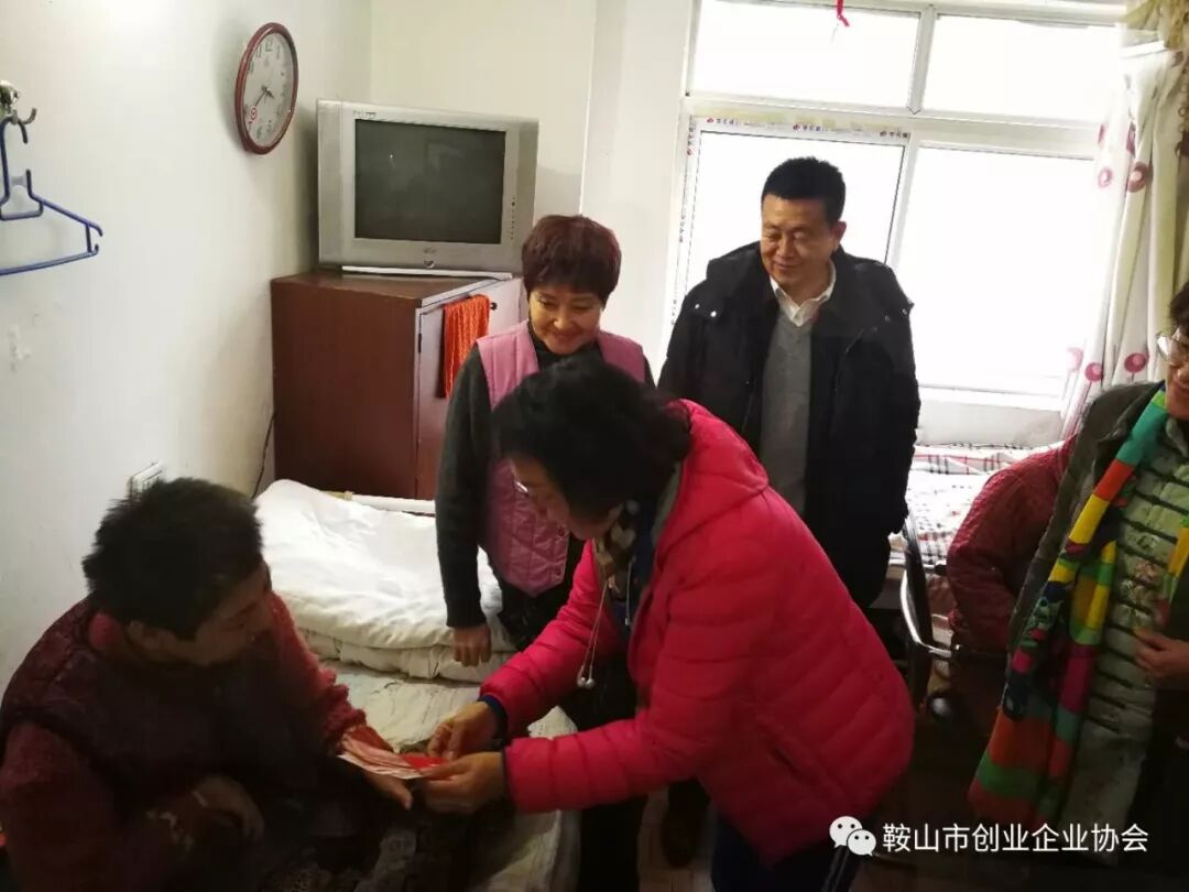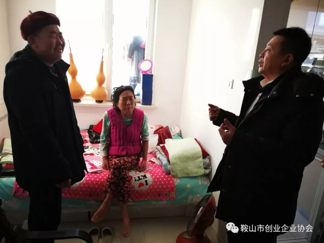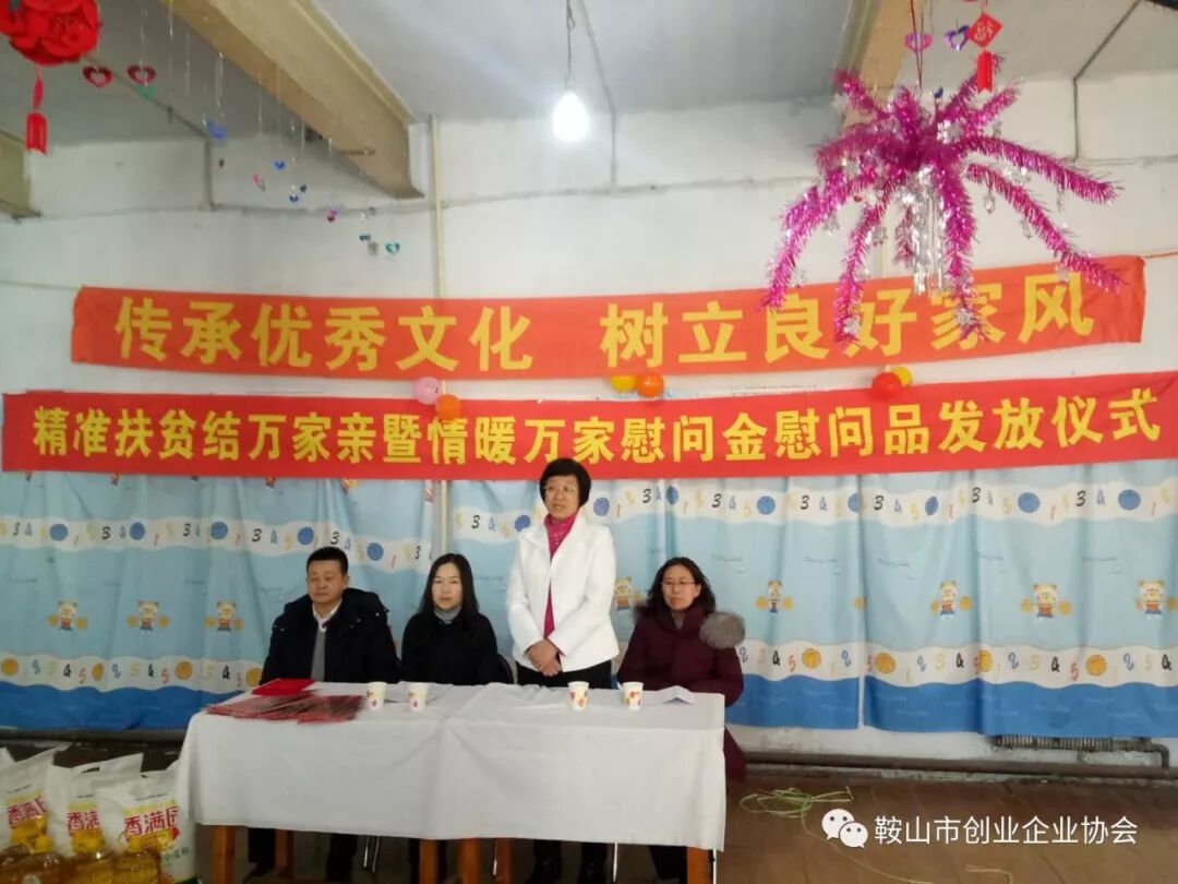 2018年2月12日,春节前夕,鞍山市妇联携手创业企业协会走访慰问特殊妇女儿童家庭。本次走访为铁东区。市妇联主席姜秀珠和张立新会长、常玉书会长带队,同行的企业家有嘉阳锻造申建军,铁西正兴商务宾馆孙乃昌,鞍山赛晨贸易公司王庆莹,铁东区类丽特美丽咨询服务中心杨洁,海城欧典安全技术咨询服务梁建平,海城信达投资咨询张艺心,缔蒙肉业高开,鞍山一方策划贺亦芳,鑫裕液化气石军,盈羡电力崔均伟,鞍山恒利机电刘振明,长兴医疗器械蔡志伟,市妇联副主席于晓丽、工会主席王君及各部门负责同志一同参加了走访慰问活动,并为八户十中社区特殊家庭送去了米面油。