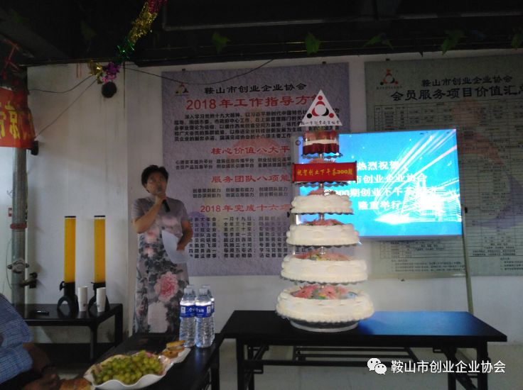 2018年8月23日鞍山市创业企业协会《创业下午茶300期》座谈会圆满举行 8月23日是不平凡的周四,创业协会第300期《创业下午茶》如期举行。70多位家人到场参与了具有里程碑意义的第300期下午茶。会场周围大型会标鲜艳醒目,六层塔型蛋糕矗立在会场前台。活动在下午2:00在协会准时开始。活动由张立新会长主持。