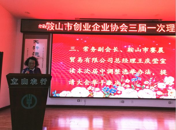 常务副会长、鞍山市赛晨贸易有限公司总经理王庆莹宣读本次届中调整选举办法,提请大会举手表决