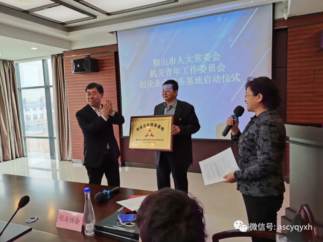 市人大机关党委专职副书记王安阁向创业企业协会会长常玉书授予“市人大机关青工委创业企业服务基地”牌匾