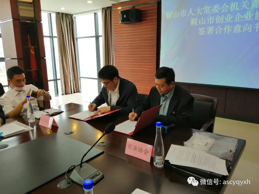 市人大机关青年工作委员会主任张绍元和鞍山市创业企业协会会长常玉书代表双方共同签署了双方合作意向书